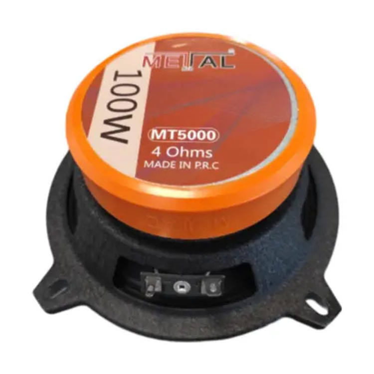 میدرنج 5 اینچ متال مدل MT5000 توان نسبتا مناسبی داشته و قابلیت راه اندازی و درایو شدن با سبک ترین آمپلی فایر های بازار را داشته و از حساسیت بالایی برخوردار است که برابر با 92 دسیبل است که برای یک میدرنج 5 اینچی عدد قابل قبولی محسوب می شود. میدرنج 5 اینچ متال مدل MT5000 با 100 ماکسیمم توان و 45 وات توان مداومی که با Rms نشان داده می شود یکی از بهترین و مناسب ترین میدرنج های سبک 5 اینچی محسوب می شود که می توانید این محصول را در کنار سیستم های صوتی خود نصب کرده و از صدای آن لذت ببرید. مقاومت و امپدانس این محصول برابر با 4 اهم بوده و شما می توانید که این محصول را به راحتی با هر آمپلی فایر و هر پخش کننده ای نصب و راه اندازی کنید که از حجم و پرتاب صدای بالایی برخوردار است. همان طور که می دانید هر کالایی را که تحت عنوان میدرنج ها مینامند باید با آمپلی فایر ها نصب کرد؛ عمده ترین و اصلی ترین دلیلی هم که می توان گفت میدرنج ها را باید با آمپلی فایر ها نصب کرد، این است که بازه فرکانسی محدودی دارند و باید با کراس اور هایی که دارند تنظیم و جداگانه فیلتر شوند. اگر فرکانس هایی که توی بازه فرکانسی میدرنج ها نباشد را فیلتر نکنید، قطعا باعث می شوید که به میدرنج های شما اسیب وارد شود و شما علاوه بر اینکه به خروجی صدای خوبی نمیرسید، بلکه با فشاری که بر روی میدرنج خود وارد کرده اید، به زودی شاهد سوختن آن خواهید بود. این محصول توی دسته بندی میدرنج هایی قرار گرفته می شود که اصطلاحا به آن ها بولت دار گفته می شود؛ میدرنج های بولت دار در حقیقت از صدای تیز تری برخوردار بوده و دما و حرارت سیم پیچ را به راحتی تخلیه می کنند که می توانید در مدت زمان بیشتری از این مدل میدرنج ها استفاده کرده و صداگیری کنید. اصولا جنس بولت این نوع میدرنج ها از نوع آلومینیوم بوده و نقش یک هدسینک را برای شما ایفا می کند، هدسینک ها به دلیل اینکه از آلومینیوم هستند و دما را به راحتی تخلیه می کنند، به شدت موثر بوده و از اهمیت بالایی برخوردار می باشند. صفحه و سوراند این محصول به صورت یک تیکه بوده و سوراند این محصول از نوع برزنت و جنس صفحه ای که دارد از نوع کاغذی است که می توان گفت به همین دلیل از پرتاب صدا و حجم صدای بالایی برخوردار است.