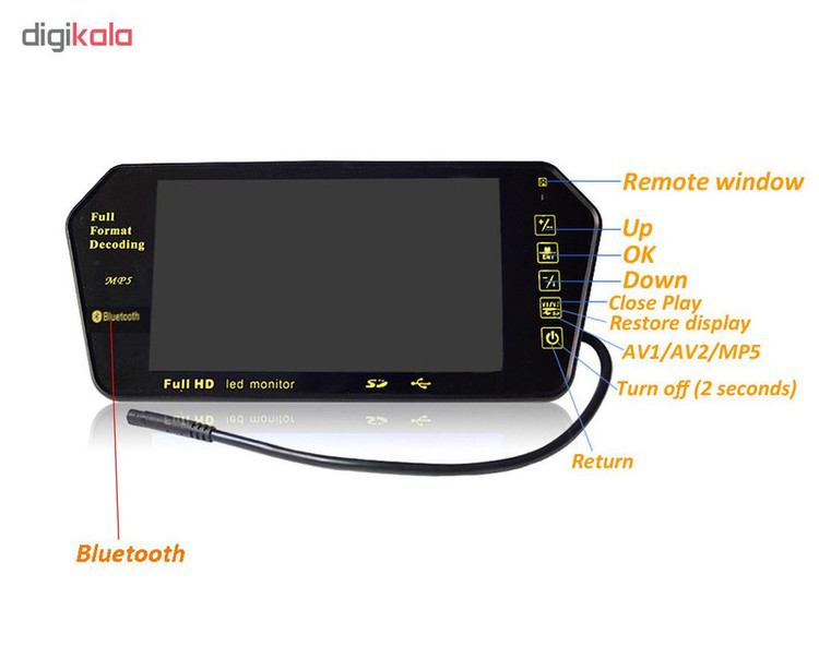 مانیتور 7" اینج لمسی خودرو مدل T-777 دارای قابلیت های بسیار و امکان نصب بر روی آینه عقب خودرو می باشد.این مانیتور 7" اینچ لمسی خودرو دارای ورودی برای فلش های USB ، وردی رم های MicroSD است که می تواند از طریق آن فایهای صوتی و تصویری و انواع عکس و فیلم را برای شما به نمایش در آورد و در واقع شما با خرید این مانیتور دارای یه پخش تصویری لمسی 7 اینج با قابلیت های بسیار می شوید.با قابلیت بلوتوث آن می توانید براحتی آهنگ مورد نظر خود را از گوشی به مانیتور انتقال داده و پخش نمایید و یا بدون در دست گرفتن گوشی خود و از طریق مانیتور و میکروفون داخلی آن به تماس های خود پاسخ دهید.این مانیتور همچنین دارای کنترل از راه دور برای کاربری آسانتر و همچنین سرنشینان عقب می باشد.این مانیتور دارای دو ورودی تصویر بوده و با اتصال یک دوربین دنده عقب به این مانیتور میتوانید به محض قرار دادن خودرو در وضعیت دنده عقب تصویر دوربین را در مانیتور ببینید همچنین می توانید ورودی دیگر به ضبط تصویری ، دی وی دی پلیر یا یک گیرنده دیجیتال مخصوص خودرو یک پیکیج کامل پخش مالتی مدیا و تلویزیون در اتومبیل خود داشته باشید.کیفیت تصویر این مانیتور بسیار بالا است و هنگامی مانیتور خاموش باشد بصورت یک آینه عمل می کند.برای انتقال صدای دستگاه به باندهای خودرو می توانید از فرستنده FM خوده مانیتور استفاده کرده و بدون هیچگونه سیمی صدا را از بلندگوهای خودرو بشنوید و خوده دستگاه نیز دارای دو عدد اسپیکر مناسب و با کیفیت است که صدای فراگیری به شما ارائه میکند.