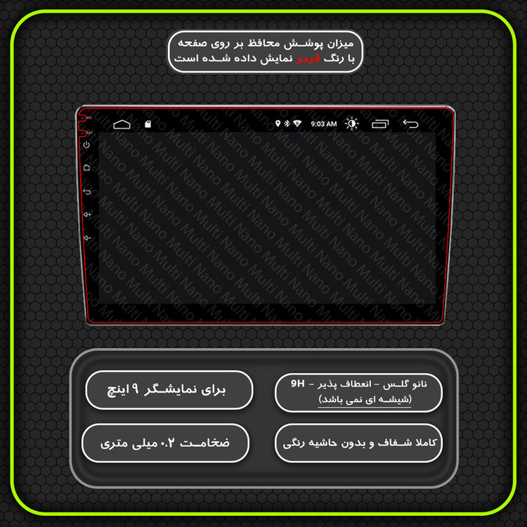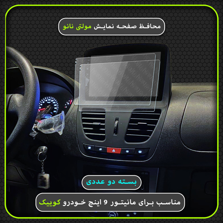 امروزه خودروها دارای دستگاه پخش هوشمند، با صفحه نمایش لمسی و ابعادی متنوع هستند و محافظت از این نوع مانیتور ها در برابر ضربات احتمالی و ایجاد خط و خش، یکی از مهمترین دغدغه های صاحبان خودرو به شمار می آید. شرکت مولتی نانو به صورت کاملا دقیق و با به روز ترین متد های اندازه گیری، محافظ هایی با ابعاد کاملا انحصاری برای نمایشگر های هوشمند خودروها طراحی ، تولید وعرضه کرده است. محافظ صفحه نمایش انعطاف پذیر نانو Multi Nano مناسب برای مالتی مدیا مانیتور خودرو سایپا کوییک سایز 9 اینچ بوده و بر روی این مانیتور قابل نصب است. محافظ نمایشگر خودرو مولتی نانو، نسل جدید محافظ های صفحه نمایش، با ساختاری شفاف که از تکنولوژی نانو در ساخت آن استفاده شده و از ضخامت 0.2 میلی متری برخوردار میباشد(شیشه ای نمی باشد) و باعث مقاومت بسیار بیشتر در برابر ضربه نسبت به گلس های معمولی شده است، همچنین کاملا نشکن است و در صورت برخورد ضربه نخواهد شکست، و به مرور زمان کدر نخواهد شد و لمس آن با توجه به ساختار تکنولوژی روغنی بسیار آسان و روان است. توجه داشته باشید که این محصول دارای برچسب اول (قبل از نصب) و برچسب دوم (بعد از نصب) می باشد و داخل بسته بندی محصول برای سهولت در نصب، لوازم کامل به همراه آموزش نصب نیز وجود دارد.xxxشما میتوانید ویدئو آموزش نصب و تست مقاومت محافظ بر روی مانیتور را در آپارات و شبکه های مجازی مشاهده کنید.xxx