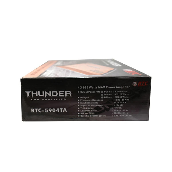 آمپلی فایر خودرو تاندر مدل RTC-5904TA را میتوان از میان رده ترین آمپلی فایر های شرکت THUNDER دانست.آمپلی فایر تاندر 5904 یک آمپلی فایر 4 کانال بوده و قابلیت های بسیار زیادی دارد.این آمپلی فایر دارای بیشینه حداکثری 3700 واتی بوده و قابلیت پل زنی نیز دارد.آمپلی فایر چهار کانال تاندر 5904 بیشتر برای کسانی مناسب است که میخواهند دو جفت باند یا میدرنج به آن نصب کنند،همچنین ساب ووفر های سبک را میتوان با این آمپلی فایر راه اندازی کرد.توان خروجی مداوم این آمپلی فایر 60×4 وات بر روی 4 اهم و 120×4 بر روی 2 اهم و 240×2 وات در حالت پل (Bridge) میباشد.در ساخت این آمپلی فایر از قابلیت HPF/LPF استفاده شده که مناسب کسانی است که نیاز به تنظیمات بهتری دارند.