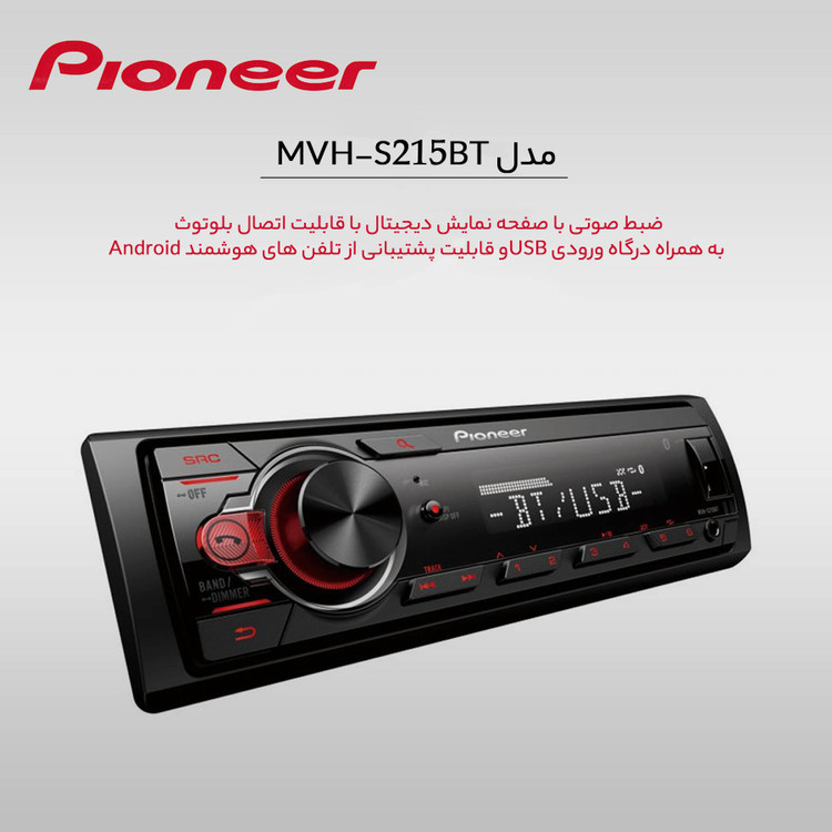 پخشکنندهی خودروی « MVH-S215BT» از محصولات کمپانی «پایونیر» (Pioneer) در سال 2020 است. این محصول با امکانات و ویژگیهای جالبی طراحی شده است. MVH-S215BT به یک عدد پورت USB مجهز است که از طریق آن میتوانید فلشمموری خود را به آن متصل کرده و از فایلهای دلخواهتان در خودرو استفاده کنید. برای راحتی کاربران، این پورت در قسمت جلویی بدنه تعبیه شده است؛ همچنین در صورتی که مایل باشید فایلهای موجود در MP3 Player خود را از ضبط خودرو بشنوید، میتوانید با استفاده از پورت AUX این مدل، پخشکنندهی موسیقی تان را به آن متصل کنید. گفتنی است که سیستمعامل سازگار با این دستگاه، اندروید و iOS هستند که میتوانید با اتصال تلفن همراه از طریق کابل، بلوتوث و اپلیکیشن پایونیر فایلهای صوتی موجود در آن را به پخش بگذارید. فرمتهای صوتی MP3 / WMA / AAC / WAV / FLAC در این مدل پشتیبانی میشوند تا کاربران بهراحتی از فایلهای موردنظر خود استفاده کنند. بیشینه توان خروجی این دستگاه 4 × 50 وات می باشد.