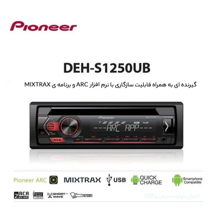 ضبط خودرو پایونیر DEH-S1250UB از سری محصولات جدید پایونیر است که تولید مجدد آن به دلیل استقبال از مدل قدیمی آن یعنی DEH-S1150UB بوده است و به خوبی بهینه سازی شده و ارتقاء یافته است. این ضبط در سایز تک دین ساخته شده و از صفحه نمایش نقطه ای- ماتریکسی بهره مند است. در جلوی پنل آن یک عدد پورت USB ، یک عدد ورودی AUX و قسمت پذیرنده CD تعبیه شده است که می توانید به طروق مختلف فایل صوتی خود را پخش کنید. همچنین قابلیت پشتیبانی از اینترفیس برای ضبط پایونیر DEH-S1150UB وجود دارد که می توانید به راحتی از کنترل روی فرمان استفاده کنید.4 خروجی RCA در پشت ضبط قرار گرفته است و به وسیله آن میتوانید 2 جفت باند به همراه ساب ووفر را متصل نمایید. فرمت های صوتی قابل پخش MP3, WAV, WMA و 5 باند اکولایزر برای آن در نظر گرفته شده است.لازم به ذکر است که توان خروجی این ضبط 4×50 وات است. هدایت و کنترل صدا بین اسپیکر های طرفین ، تنظیمات ساب ووفر ، فیلتر HPF ، BASS BOOST ، LOUDNESS ، SLA از دیگر ویژگی های منحصر به فرد این ضبط حرفه ای است.