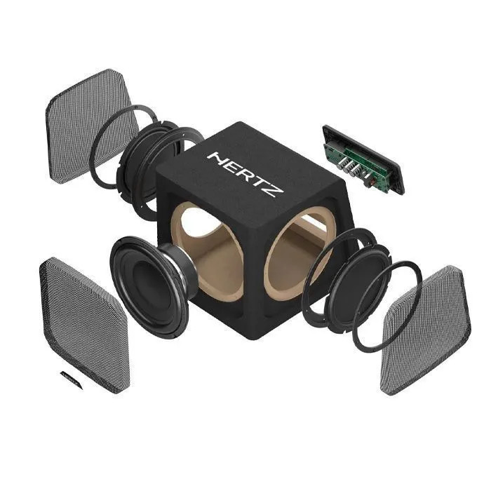 ساب باکس اکتیو جدید برند هرتز که دارای یک عدد ساب ووفر 8 اینچی و دو عدد رادیاتور پسیو 8 اینچ در دو طرف میباشد.