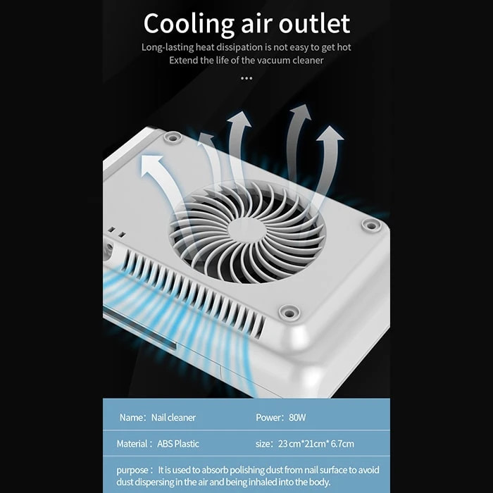 1.ابزاری ضروری و حرفه ای برای مانیکور و پدیکور ناخن. 2.موتور قدرتمند مکش قوی، بدون کثیفی روی ناخن را تضمین می کند. 3.کارکردن آسان تر فقط کافی است دستان خود را نزدیک سوراخ پنکه قرار دهید تا تکه های ناخن به راحتی جذب شوند. 4.سطح نرم و صاف تجربه مانیکور را برای شما فراهم می کند. 5.مناسب برای جمع آوری تکه ها و گرد و غبار ناخن انگشت .