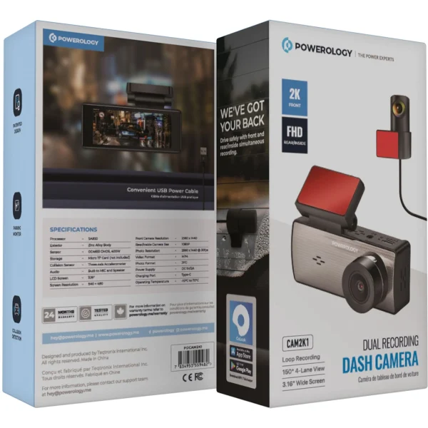 دوربین خودرو Powerology PDCAM2K1 با قابلیت ضبط همزمان از جلو و عقب، یکی از حرفهایترین ابزارهای نظارتی برای خودروی شماست. این دوربین با لنز زاویه باز 150 درجه، دیدی گسترده از چهار لاین جاده فراهم میکند و تمامی جزئیات مهم سفر را ثبت مینماید. دوربین جلو با وضوح فوقالعاده 2560×1440 پیکسل و دوربین عقب/داخل با کیفیت 1080P، تصاویری شفاف و باکیفیت ارائه میدهند.