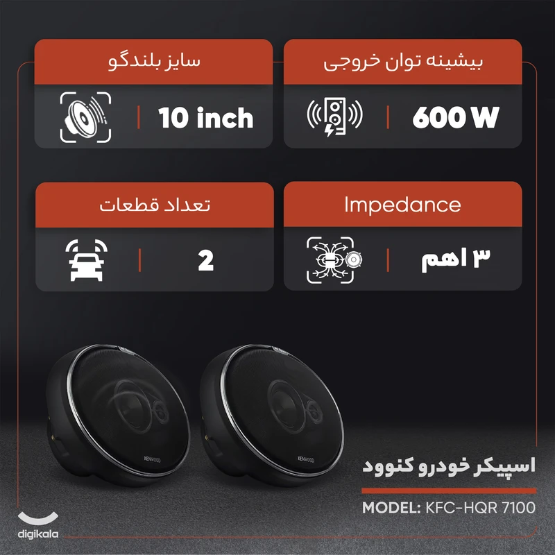 «KFC-HQR7100» نام یکی از اسپیکرهای خودروی کننوود است که مانند سایر محصولات این شر کت از کیفیت ساخت بالایی برخوردار است و میتواند صدایی قدرتمند را به گوش شما برساند. بیشینه صدای خروجی دستگاه چیزی در حدود 600 .وات است که صدای با کیفیتی محسوب میشود. در کنار این مقدار میتوان به توان اسمی 150 واتی آن هم اشاره کرد که بیانگر تولید یک صدای بسیار خوب در خوب در روی شماست. این محصول دارای امپدانس 3 اهم و قدرت فرکانس 63 تا 20000 هرتزی است. ابعاد این بلندگو 7 × 10 اینچ بوده و لایهی محافظ آن بلندگو را در برابر آسیب دیدن بر اثر بیس بالا مقاوم میسازد. همچنین این اسپیکر مانند هر اسپیکر باکیفیت دیگر، مجهز به ووفر، میدرنج و توییتر است که ابعاد آنها به ترتیب 254×177.8، 25 و 70 میل متر است. کارایی امکانات نامبرده، تقویت انواع صدا اعم از صدای زیر ، حد وسط و بم است. همچنین کیفیت صدای هر اسپیکر تا حد زیادی به این موارد بستگی دارد. شایان ذکر است کمپانی کنوود، در تولید اسپیکر همواره عملکرد خوبی داشته و محصولاتش در این زمینه قابل رقابت با برندهای دیگر هستند.